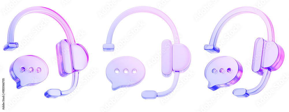Customer service, call center, phone support. Render 3d set of glass holographic headphones with speech bubble chat icon. AI agent or hotline helpdesk operator headset with message #1883066705