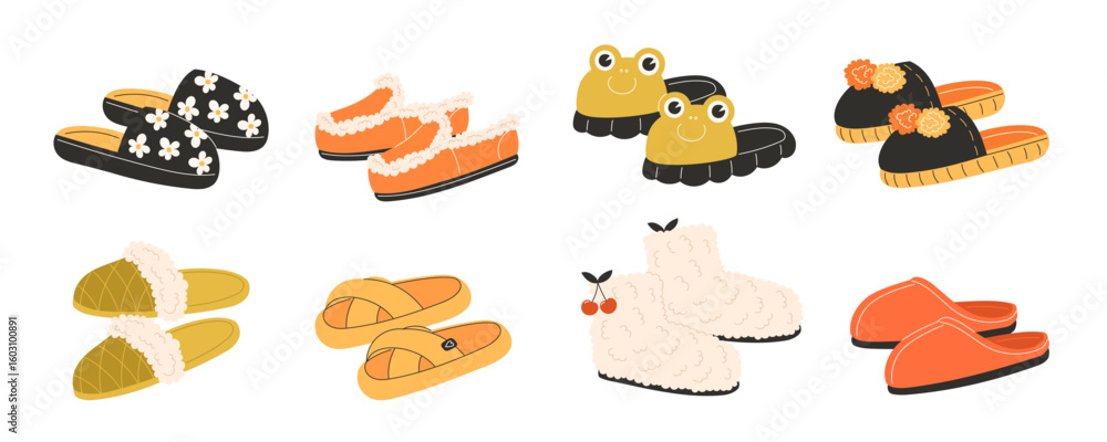 • #1603100891 Cute autumn slippers set flat style cozy home footwear collection perfect for seasonal designs thanksgiving fall fashion and children’s illustrations
