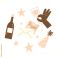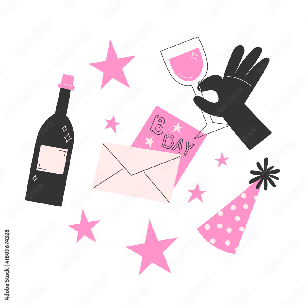 Cute birthday illustration with wine bottle, glass, party hat and festive greeting for card #1809674328