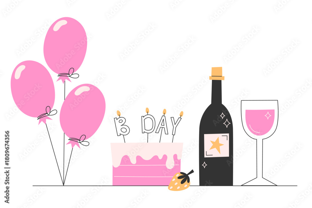 Cute birthday illustration with wine, glass, festive cake and balloons for greeting card #1809674356
