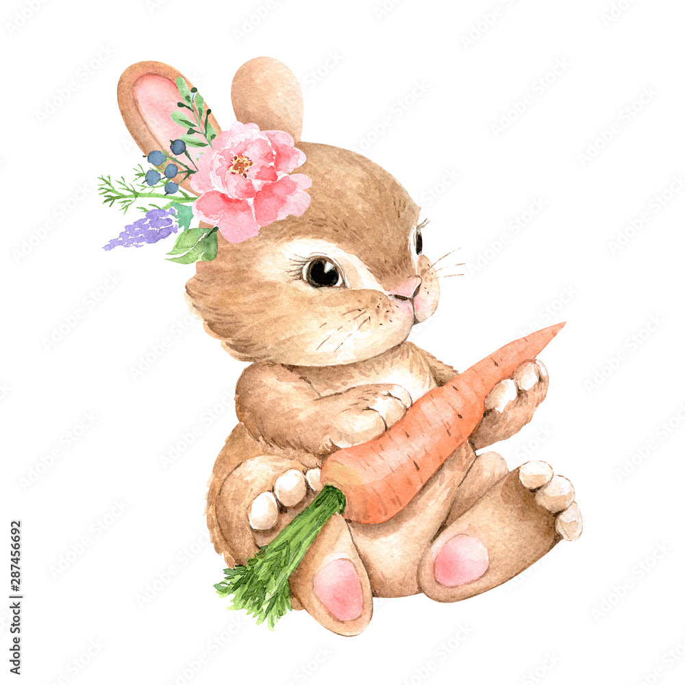 cute bunny with a flower on his head and a carrot, watercolor illustration #287456692