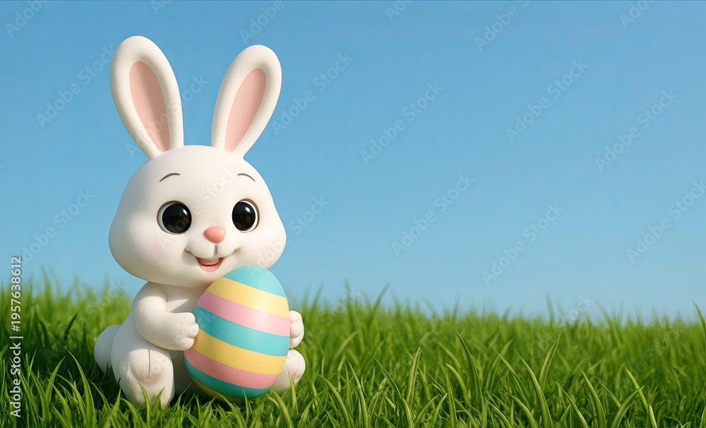 Cute Cartoon Easter Bunny Holding an Easter Egg in a Meadow Against a Blue Sky #1957638612