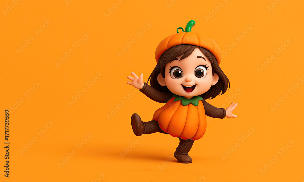 Cute Cartoon Girl Dressed as a Pumpkin for Halloween on an Orange Background. #1717739559