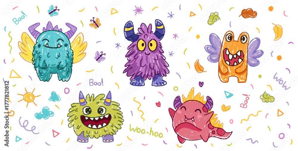 Cute crayon monster set, doodle spooky kids creature, colorful hand drawn pencil vector illustration. Monster drawing for kids or children notes or cover design #1777821812