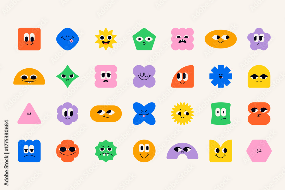 Cute geometric shape characters. Abstract funny geometry figures with faces with different emotions, square triangle circle rectangle rhombus smiling emojis. Vector isolated set #1775380684
