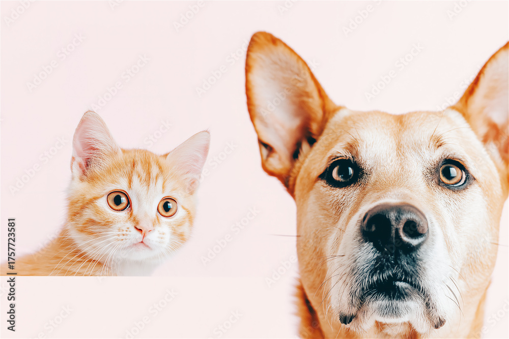 Cute ginger cat and dog side by side on pastel background looking up. Pet friendship, curiosity and innocence ideal for animal care campaigns and emotional marketing. Copy space included. #1757723581