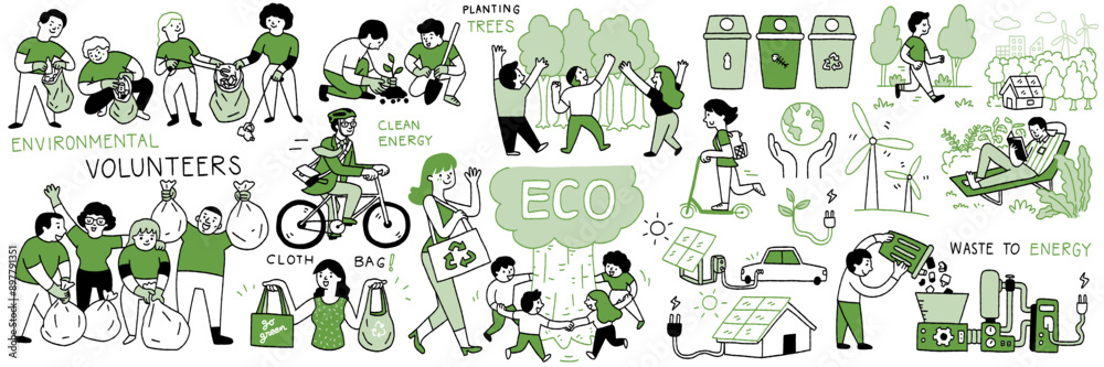 Cute hand drawn character and object of ecology concept. Outline, linear, thin line art, doodle style. #897791351