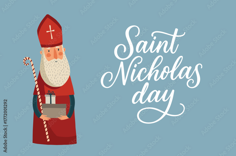 Cute Saint Nicholas, Sinterklaas character. Happy St Nicholas day greeting card, invitation with lettering text. Christmas St Nick old man bishop bringing gifts. Vector illustration banner #1772001292