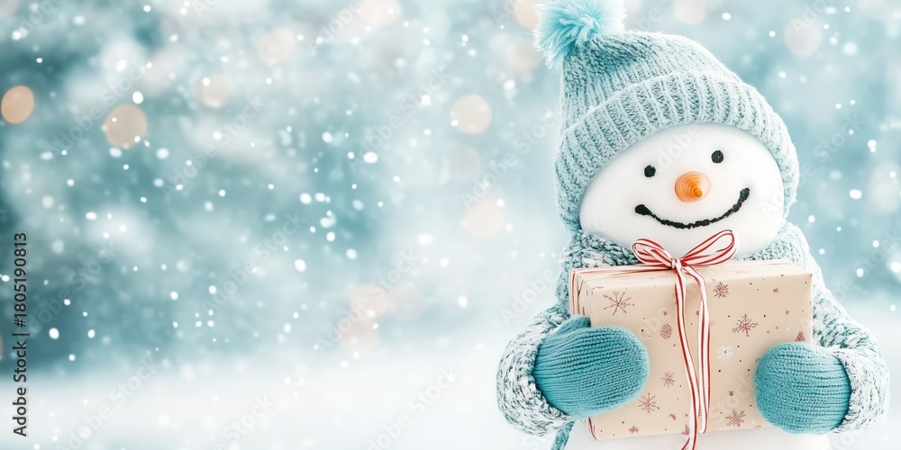Cute snowman standing in the snowdrift in the forest. Xmas card and poster concept. #1805190813