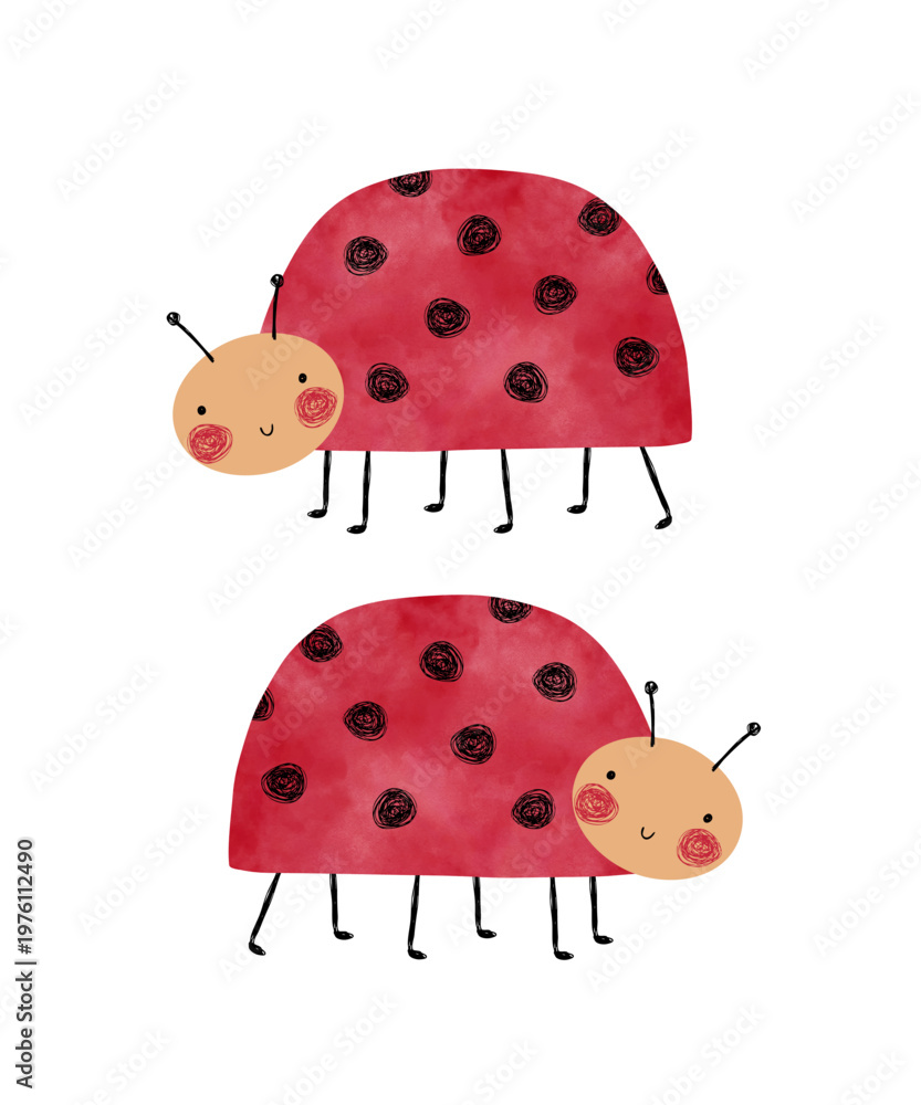 Cute vector illustration of ladybugs on a white background. Charming cartoon ladybugs in a hand‑drawn vector style, fully layered and editable, perfect for children’s designs, prints, stickers. #1976112490