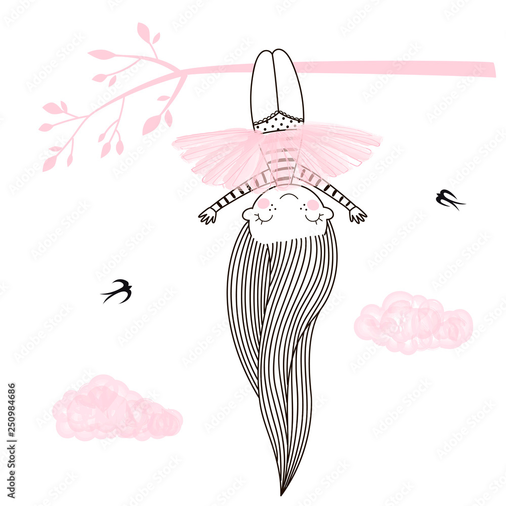 Cutelittle girl in pink ballerina skirt hanging head down on the tree. Vector doodle illustration in pink colour for girlish designs like textile apparel print, wall art, poster, stickers, cards and #250984686