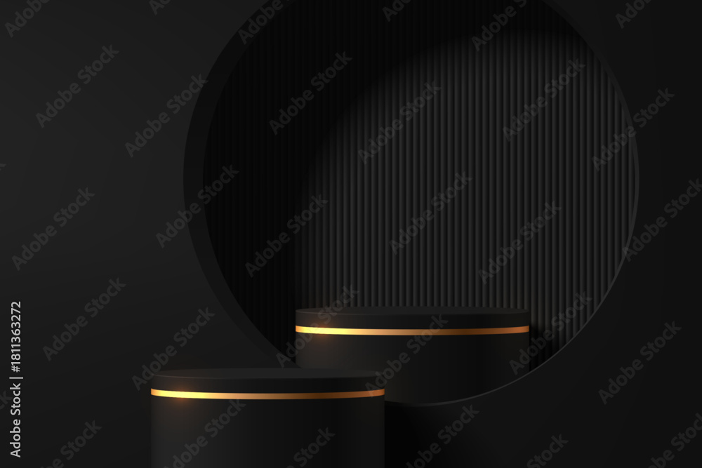3D black gold round product podium background in circle window. Black Friday theme. Abstract geometric composition minimalist design. studio display showroom pedestal, Fashion stage showcases mockup #1811363272