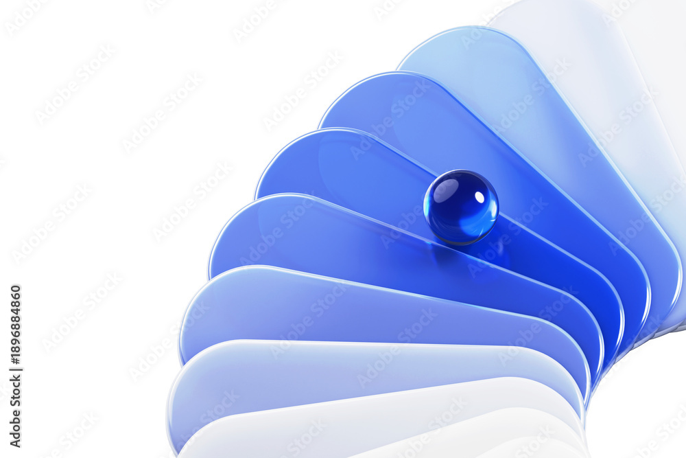 3d blue gradient glass layer texture with crystal sphere on white background. Abstract geometry design with rounded rectangle plate shapes and ball with reflection on glossy surface #1896884860
