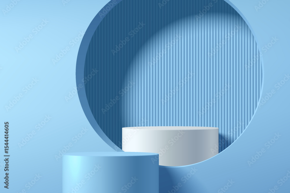 3D blue podium background and White podium in circle window. Abstract composition minimalist design. Studio display showroom cosmetic stand product pedestal, Fashion stage showcase mockup wall scene. #1544414605