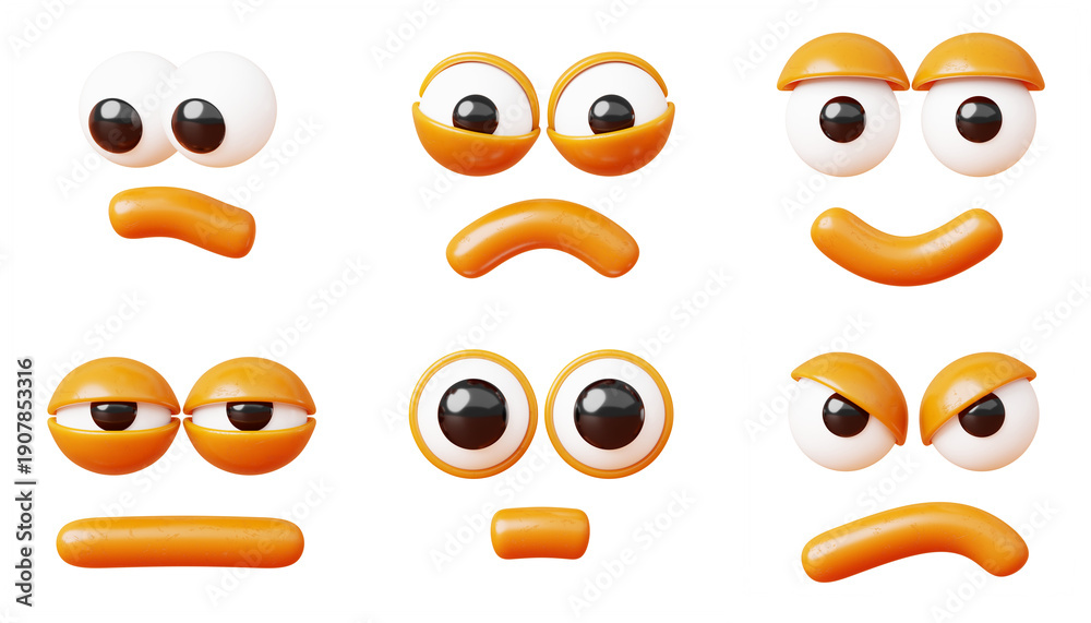 3d cartoon faces, expressive eyes and mouth for animated character design. Render set of comic facial expression, looking down, smiling, sad, sleepy, angry and surprised emotions #1907853316