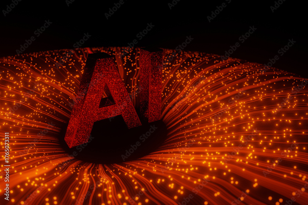 3D red glowing letters “AI” surrounded by abstract light lines and digital particles. Futuristic concept of artificial intelligence, big data, and technology innovation. #1765073311