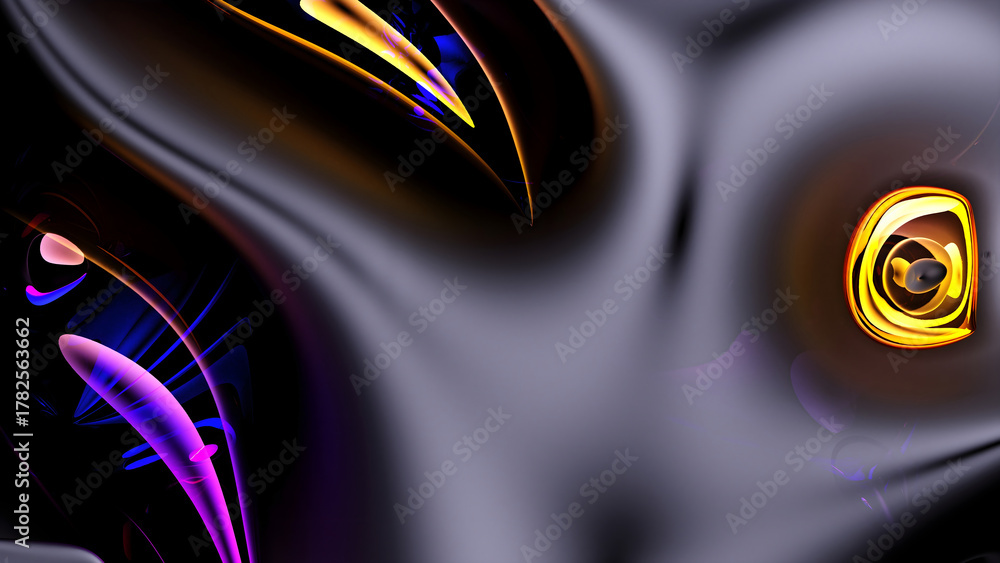 3d render of abstract art 3d background with part of surreal alien flower in a curved, wavy smooth and soft organic lines forms in translucent rubber plastic material with glossy glass parts in yellow #1782563662