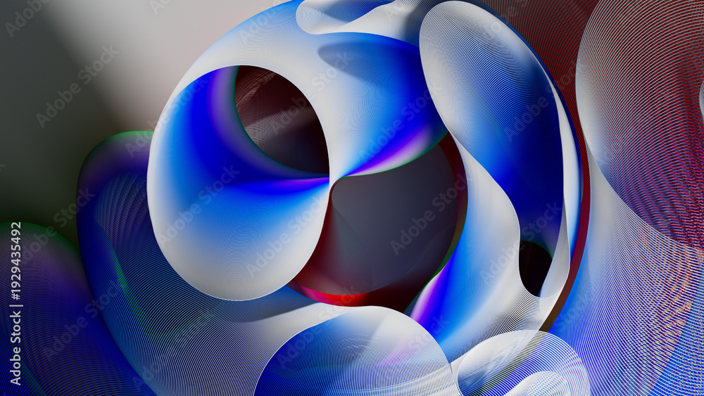 3d render of abstract art of surreal circles, ropes on a curve, wavy organic lines, forms in a deformation transformation process in purple and white, and blue gradient color #1929435492