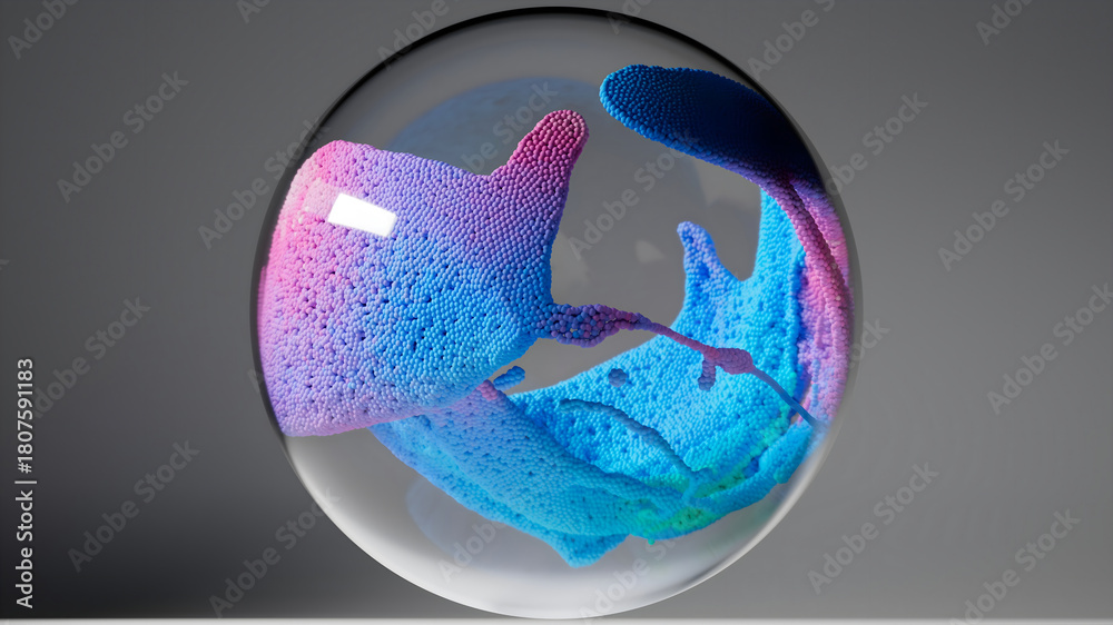3d render of abstract art surreal glass sphere ball with organic substance inside based on connected small balls spheres as molecular structure particles in deformation transformation process #1807591183