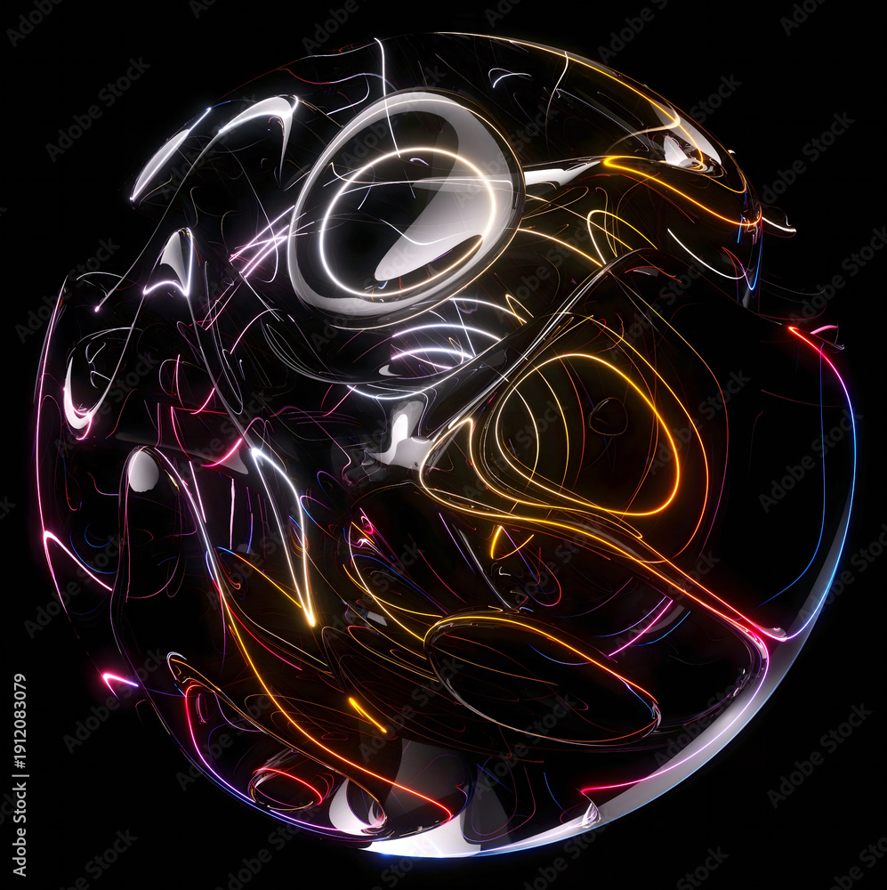 3d render surreal mystic alien ball or sphere sculpture in curved, wavy organic lines forms in a deformation process in translucent liquid glass material with yellow, blue, purple laser round stripes #1912083079