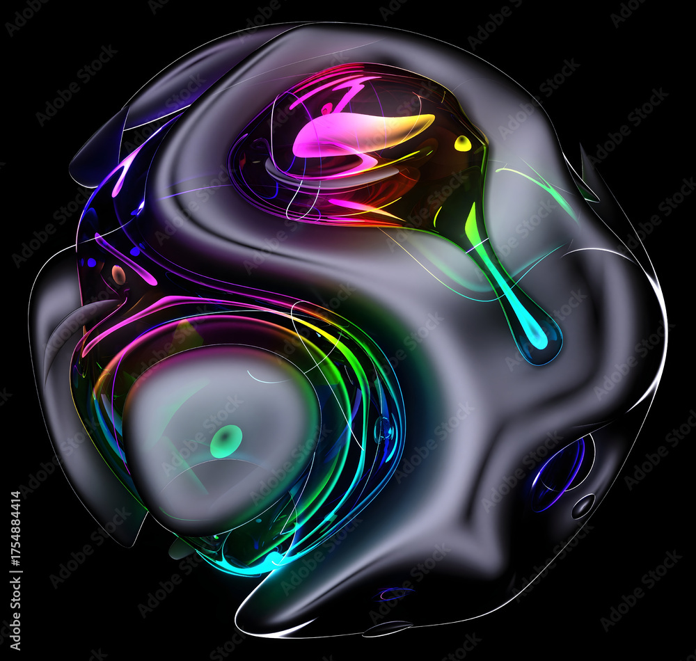 3d render video art of a glossy, dark, 3D sphere with swirling, vibrant, metallic light reflections on a sleek black background. The sphere features iridescent folds and a dynamic, fluid appearance #1754884414