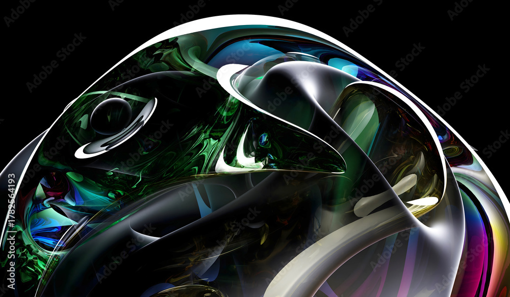 3d render with part of the surreal alien spherical ball flower in curved wavy organic lines in round shapes in plastic and glass material in green and yellow gradient color on black #1782564193