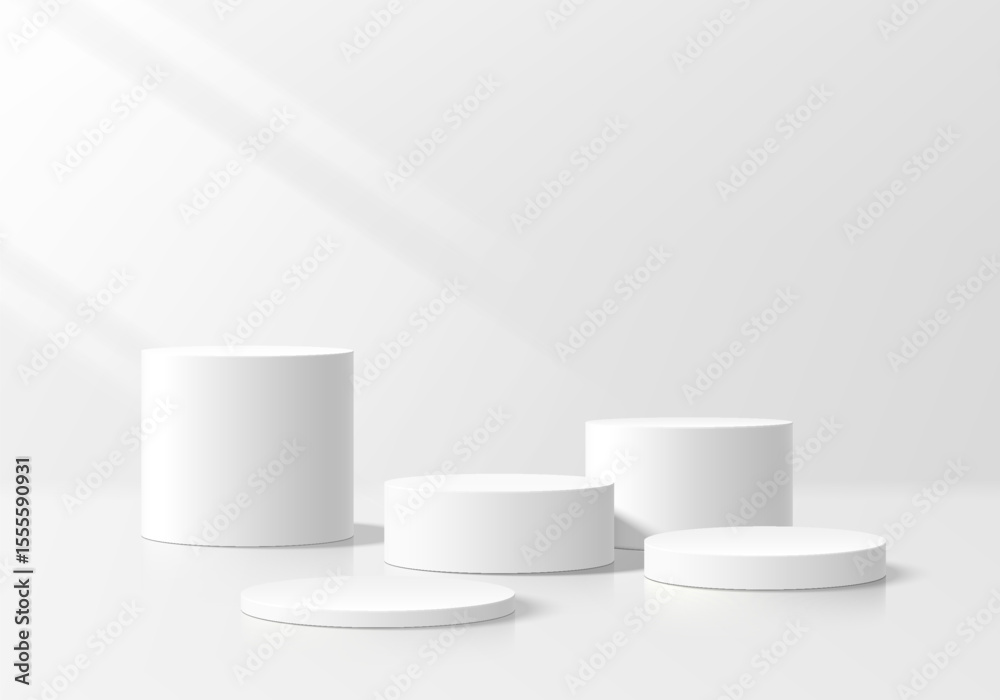 3D white round podium set background with light and shadow. Abstract geometric composition in minimalist design. 3D studio display showroom product pedestal, Fashion stage showcase mockup scene. #1555590931