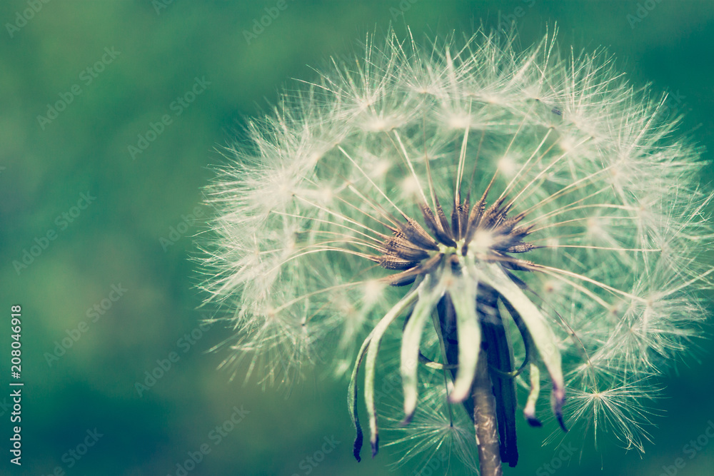 Dandelion head close up macro photo with bokeh background out of focus. Photo post processed with green and blue filter for a nostalgic cross process effect. #208046918