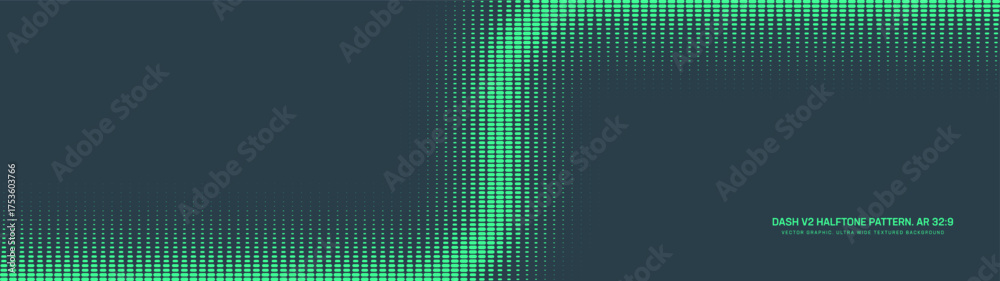 Dash grid halftone pattern curved border ultra wide 32:9 aspect ratio mint green vector conceptual abstract background. Dashed structure half tone ultrawide format retro futuristic technology concept #1753603766