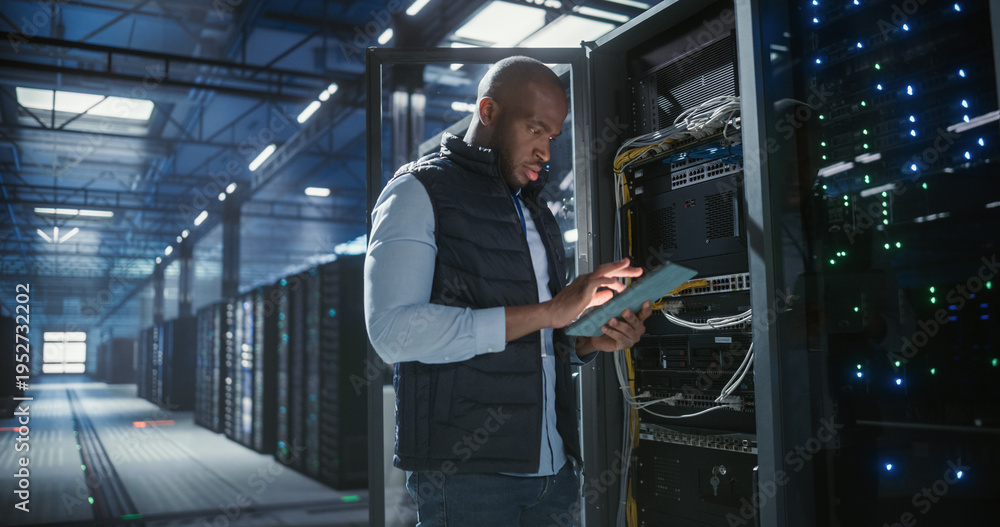 Data center technician inspects server racks, checks network cables, and uses a tablet to monitor hardware status. Rows of illuminated servers, digital infrastructure, and secure network operations. #1952732202