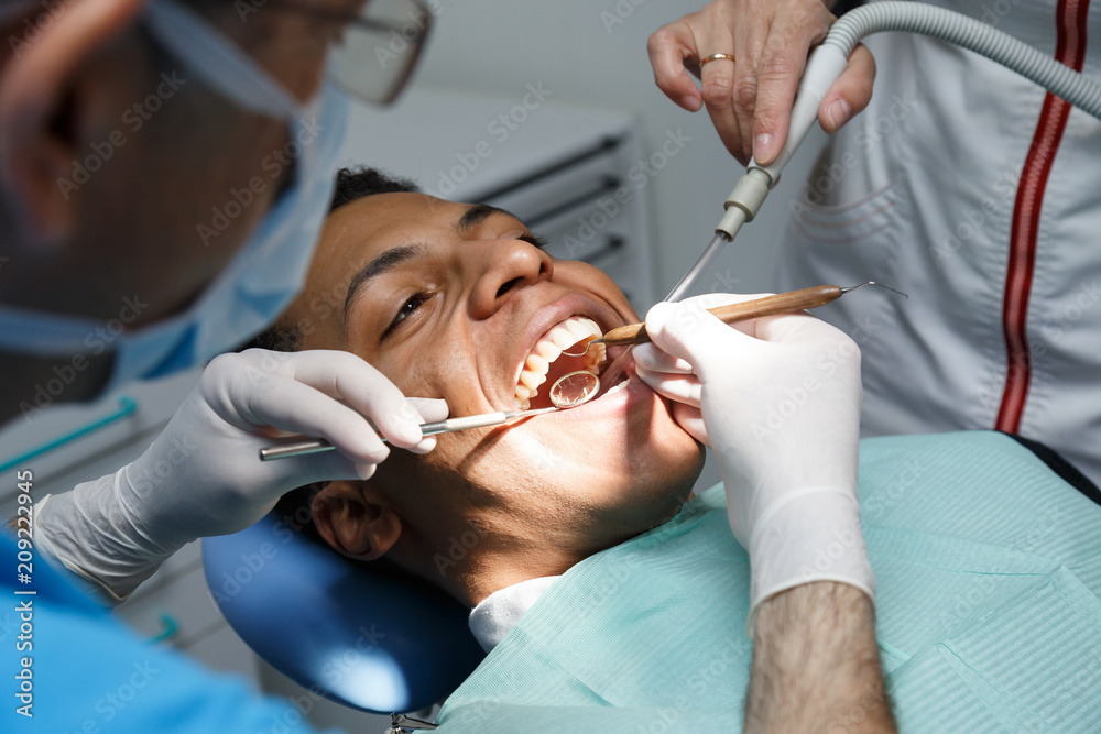 Dentist examining oral cavity of young African-American man working in in dental clinic with assistant. #209222945