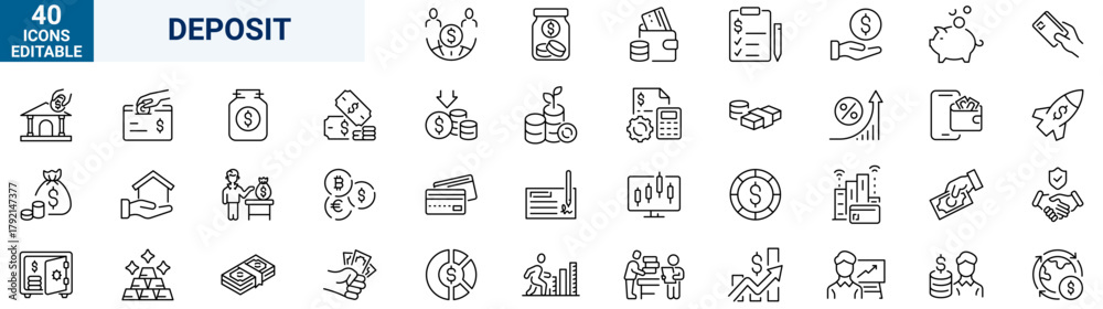 Deposite investment web icons in line style. income, money, business. Outline icon collection. Editable stroke. Vector illustration #1792147377