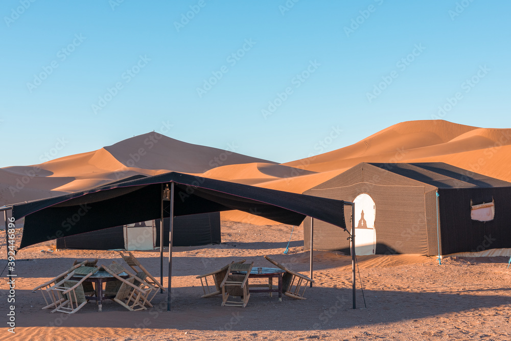 Desert camp in dunes of Erg Chigaga, at the gates of the Sahara. Morocco. Concept of travel and adventure. #392446896