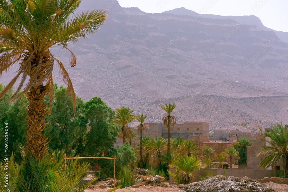 Desert villa with palm trees, adobe houses and mountains in the background. Morocco. High Atlas, Morocco #392446054