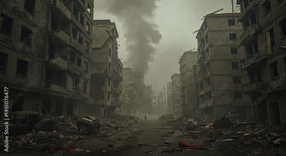 Destroyed city street with rubble and smoke plumes. War zone ruins with distant figures walking through debris. Post-apocalyptic urban landscape with wrecked cars #1951076477