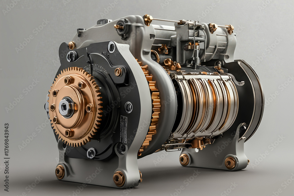 Detailed close-up of industrial mechanical engine component with gear system #1769843943