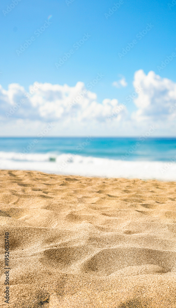 Detailed close-up of rippled golden beach sand in the foreground, contrasted with a softly blurred sea and sky background (bokeh). Peaceful coastal nature texture for copy space. #1952453740