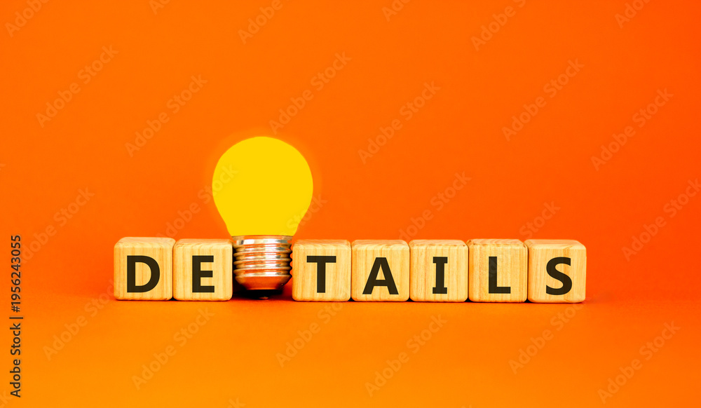 Details detail symbol. Concept word Details on beautiful wooden blocks. Beautiful orange background. Beautiful yellow light bulb. Business details concept. Copy space. #1956243055