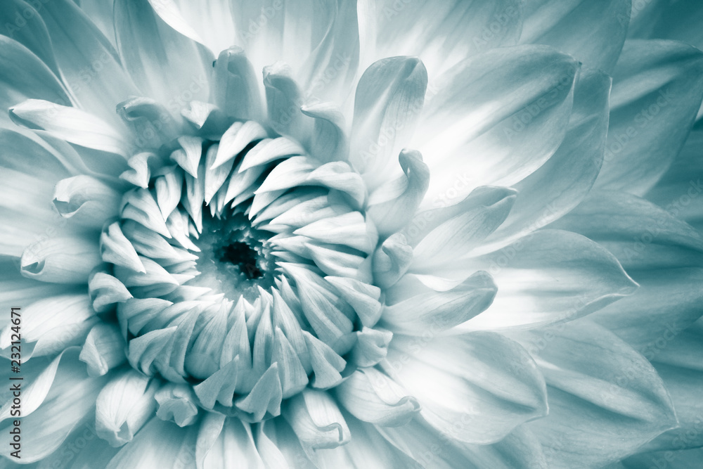 Details of white and light blue dahlia fresh flower macro photography. Color toned photo with greenish turquoise tones emphasizing texture and intricate floral patterns. #232124671