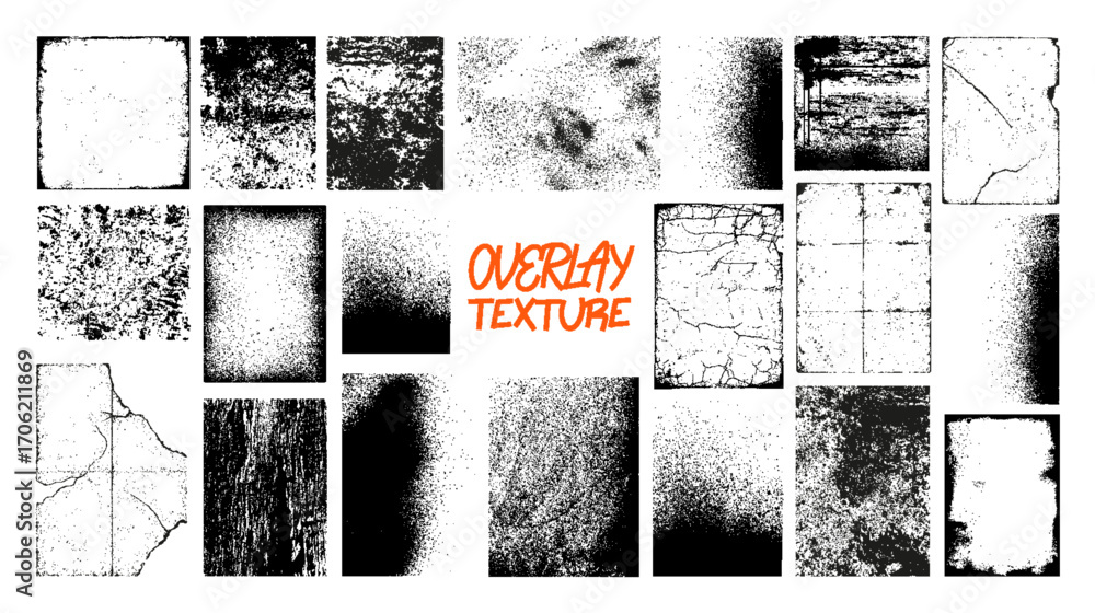 Different types overlay texture, stamps (grunge, dust, old paper, grain, torn, worn, concrete, spray, ink splashes) Overlay texture stamps for old effect. Grunge frames with spray. Vector graphic set #1706211869