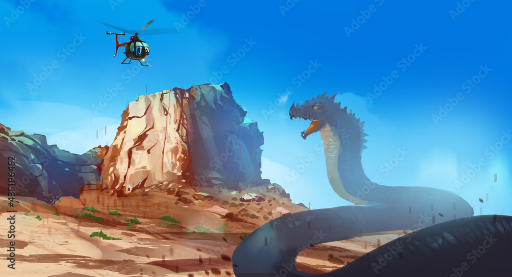 Digital illustration painting design style giant cobra ready to attrack a helicopter, movies scence. #435196452