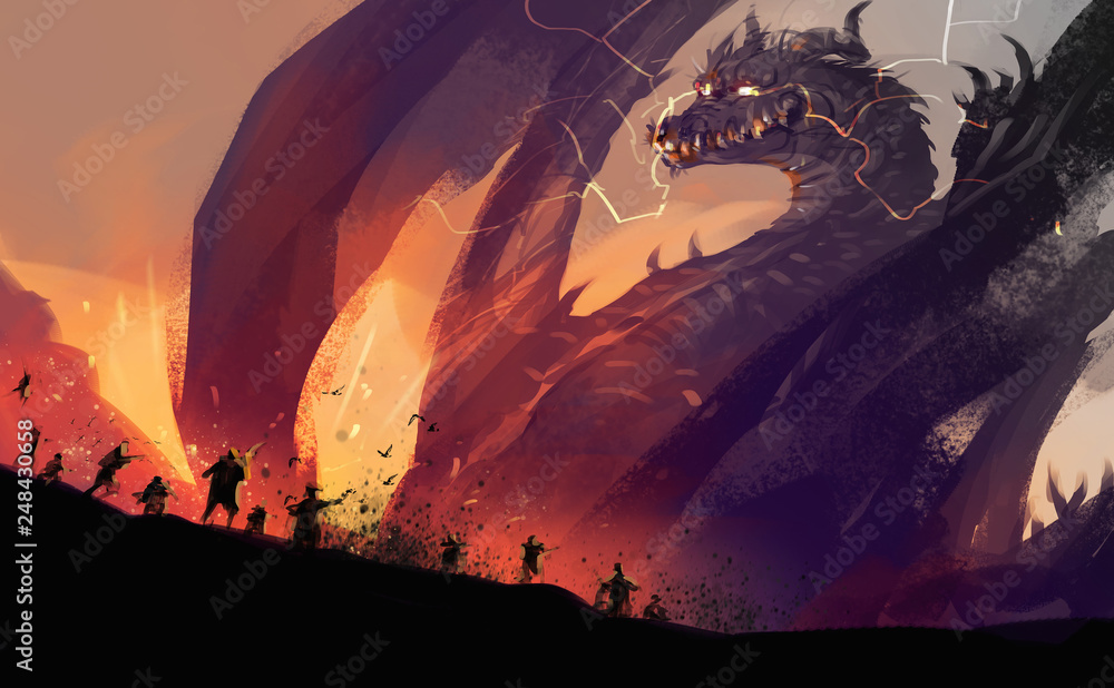 Digital illustration painting design style peoples against a huge dragon with destroyed town. #248430658