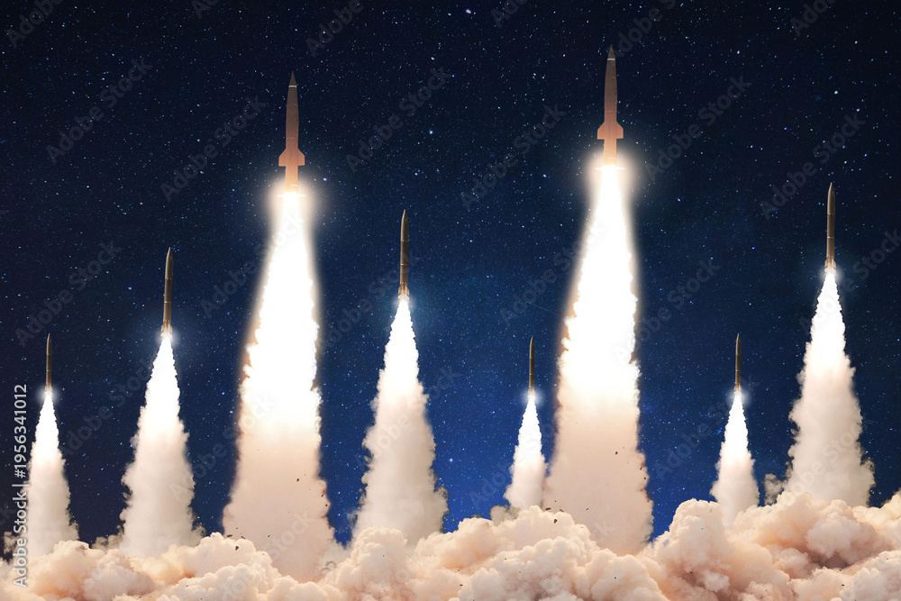 diverse ballistic missiles being launched simultaneously at night under a starry sky, depicting a strategic missile strike scenario involving Iran, with massive plumes of smoke and light. War #1956341012