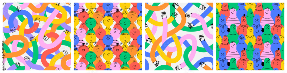 Diverse colorful people seamless pattern illustration set. Funny multicolor hand community background print. Friend team, business teamwork or community hands together drawing collection. #764235190