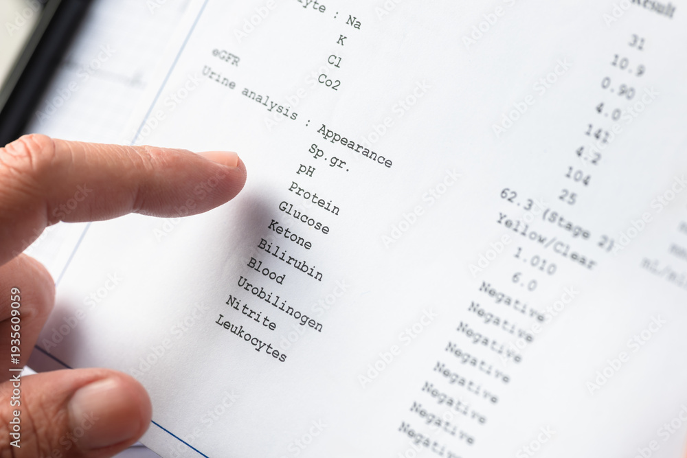 Doctor reviewing urine analysis laboratory report during medical examination #1935609059