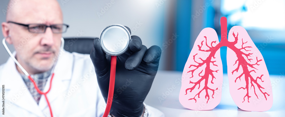 Doctor with stethoscope examining lung health, medical concept of respiratory system and pulmonology. Medicine, Healthcare. #1761202185