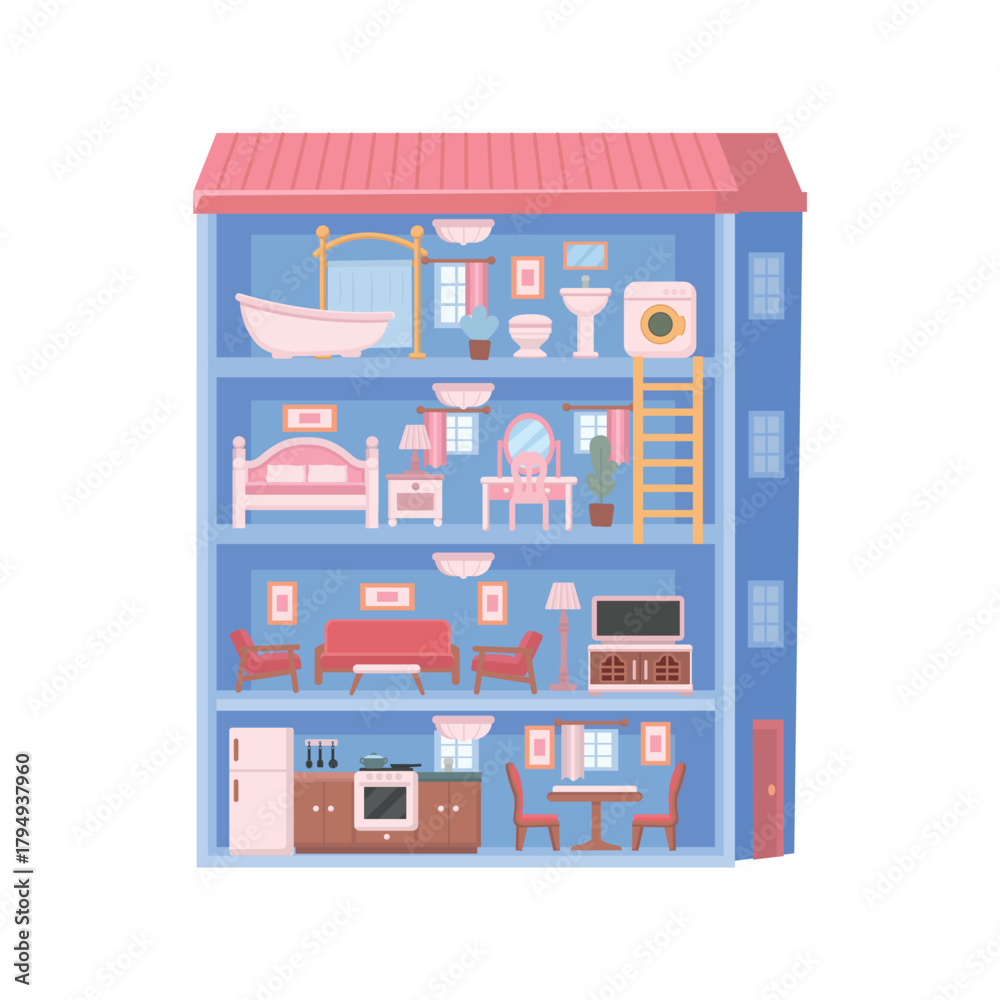 Dollhouse with furniture. Large house with a bathroom, bedroom, living room, and kitchen. Flat vector cartoon. #1794937960