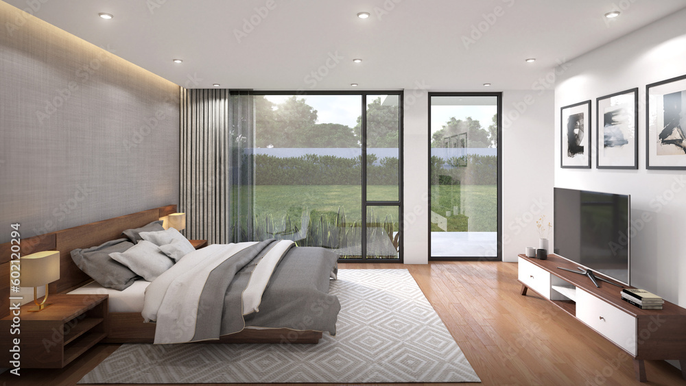 Dormitorio con vista a patio terraza, 3D render #602120294