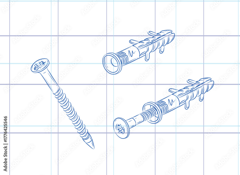 Dowel and screw composition drawing in graphic style on light background #1776425546