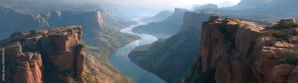 Dramatic landscape view of canyon with river and imposing cliffs under a cloudy sky #1950349554